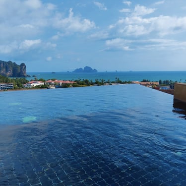 Avani Ao Nang Cliff Krabi Resort ligt op slechts 500 meter van het strand, midden in het levendige hart van Ao Nang, pal aan de bruisende main road. Maar laat je niet misleiden: zodra je binnenstapt, is het een oase van rust! De ingang oogt bescheiden, maar eenmaal binnen snap je direct waarom het ‘Cliff Resort’ heet. De gebouwen zijn spectaculair tegen de klifwand gebouwd, wat een adembenemend effect geeft. Wij zaten in het vierde (voorlaatste) gebouw, recht naast het infinity pool met een fenomenaal uitzicht over het strand en de zee. Ondanks de levendige omgeving hoorde je níéts van de main road – pure magie!