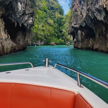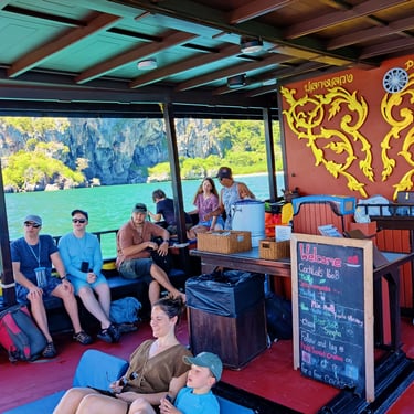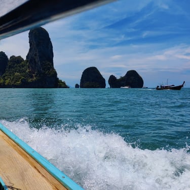 Het zonnetje schijnt, de sfeer zit goed, en we krijgen ineens zin in een beetje avontuur. Dus waarom niet? We stappen spontaan in een longtailboot richting het beroemde Railay Beach.