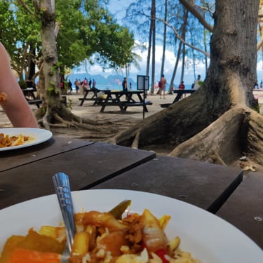 Voor het middageten gaan we aan wal op Koh Phi Phi zelf. We krijgen een eenvoudige maar heerlijke maaltijd, en wandelen daarna nog even rond op het eiland. De tijd vliegt.