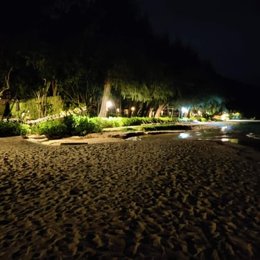 We sluiten de dag af met nog een wandeling langs het strand, terwijl de zon langzaam zakt achter de eilanden.