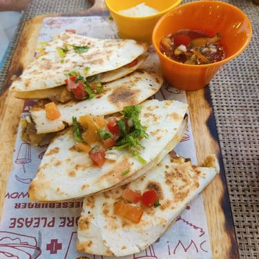 Omdat ik hou van afwisseling (en omdat ik in Thailand al genoeg Pad Thai heb gezien), ga ik vandaag voor een hamburger. Caithlyn en Nadine kiezen iets typisch Mexicaans — waarvan ik de naam al vergeten ben, maar het rook lekker.