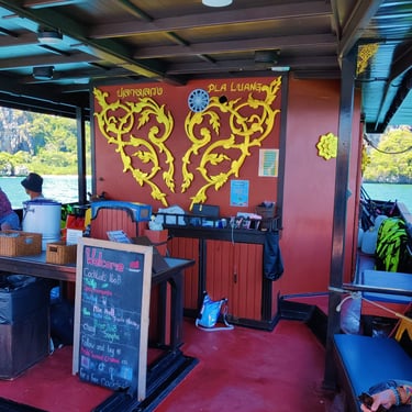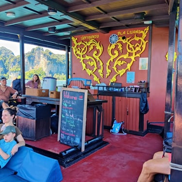 In tegenstelling tot de kleine longtailbootjes die je vaak ziet, stappen we dit keer aan boord van een grotere versie waar zo’n 20 à 30 mensen in passen. De kapitein kijkt me eens goed aan en wijst me vriendelijk maar beslist het midden van de boot toe.