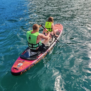 We keren terug, pakken het paddleboard terug naar het piratenschip en varen verder.