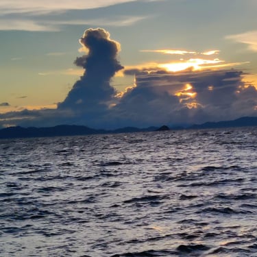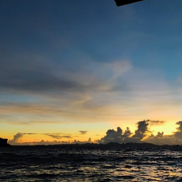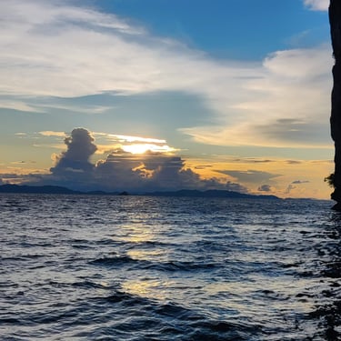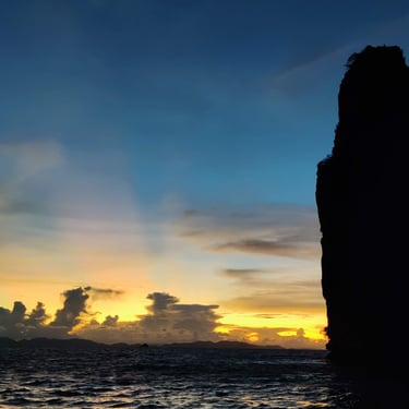 Terwijl we aanmeren bij de beroemde James Bond Island, krijgen we een heerlijke late lunch geserveerd. De zon zakt langzaam achter de horizon — en het uitzicht is simpelweg onvergetelijk. Gouden gloed op het water, zacht klotsende golven, rust.